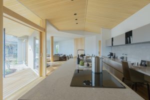 大きな窓から光がやわらかく広がり、木の床や天井を優しく照らします。