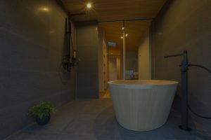まず、皆様にぜひ体感していただきたいのが、扉を開けた瞬間に立ち上る清々しい香りに包まれる浴室です。ここで主役を務めるのは、美しいオーバル型のバスタブ。素材には、古くからその強靭さで知られる「檜葉(ひば)」を贅沢に使用しました。
