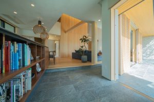 庭の石畳から緩やかに続くタイルの土間は、一段上がった無垢材のフローリングへと淀みなく繋がります。