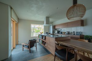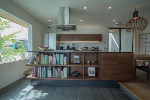 キッチンと隣接した土間には大容量の本棚を設え、趣味の読書に耽ったり、家族の気配を感じながらも自分だけの時間を愉しんだりと、使い方は住まう人の感性でどこまでも広がります。